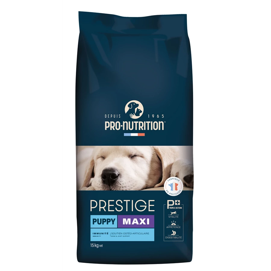 A Prestige Puppy Maxi kifejezetten a nagytestű kölyökkutyák számára lett kifejlesztve, hogy biztosítsa a harmonikus növekedést és az egészséges csont- és izomfejlődést.