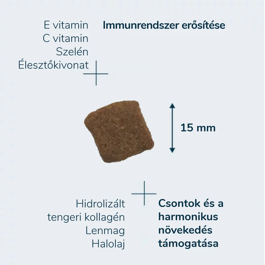 A táp receptúrája hidrolizált tengeri kollagént, kondroitin- és glükozamin-szulfátot tartalmaz, amelyek támogatják az ízületeket és a mozgásszervek egészségét.