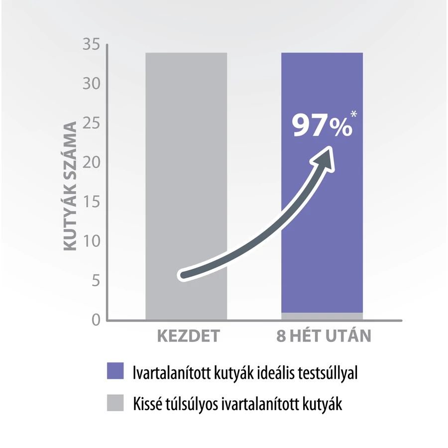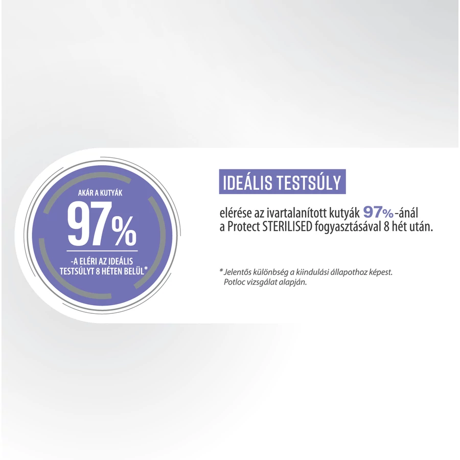 • Akár az ivartalanított kutyák 97%-a eléri az ideális testsúlyt 8 után után a Protect STERILISED táp fogyasztásával.