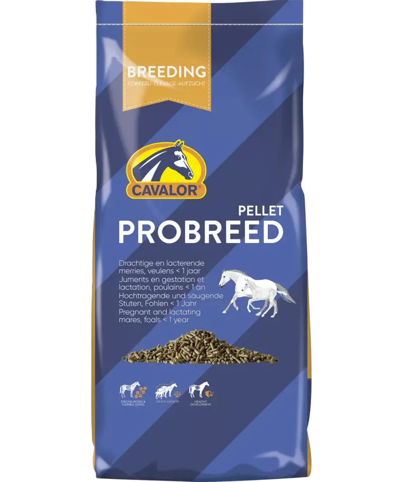 A Cavalor BREEDING – Probreed Pellet prémium tenyésztési takarmány, amely a vemhes és szoptató kancák, valamint a csikók célzott igényeire készült: kiegyensúlyozott növekedést, erős csontozatot, stabil emésztést és erős természetes immunitást támogat.Mindig biztosíts elegendő friss, tiszta ivóvizet!